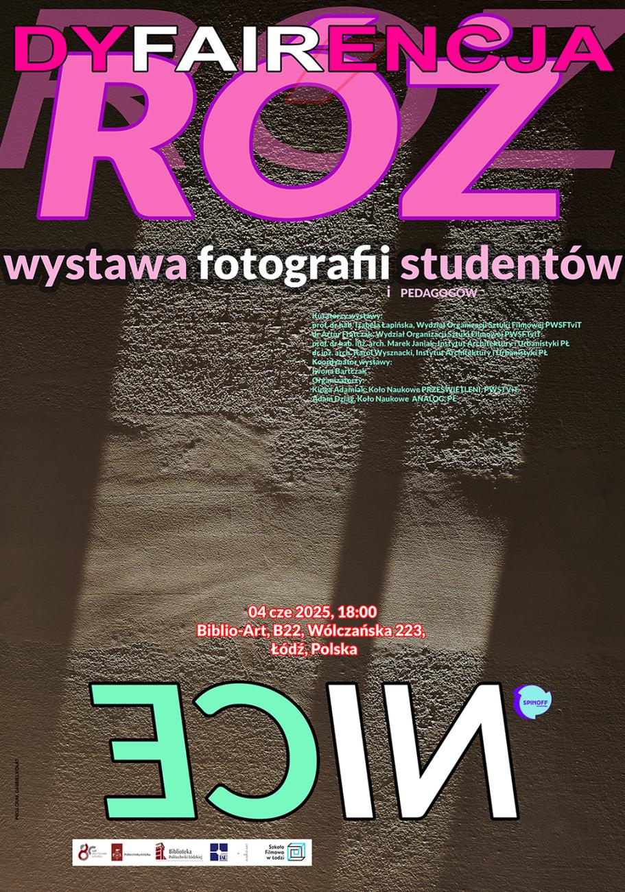Wystawa fotografii DYFERENCJA została przygotowana wspólnie przez studentki i studentów Wydziału Organizacji Sztuki Filmowej PWSFTviT w Łodzi oraz Instytutu Architektury i Urbanistyki PŁ.